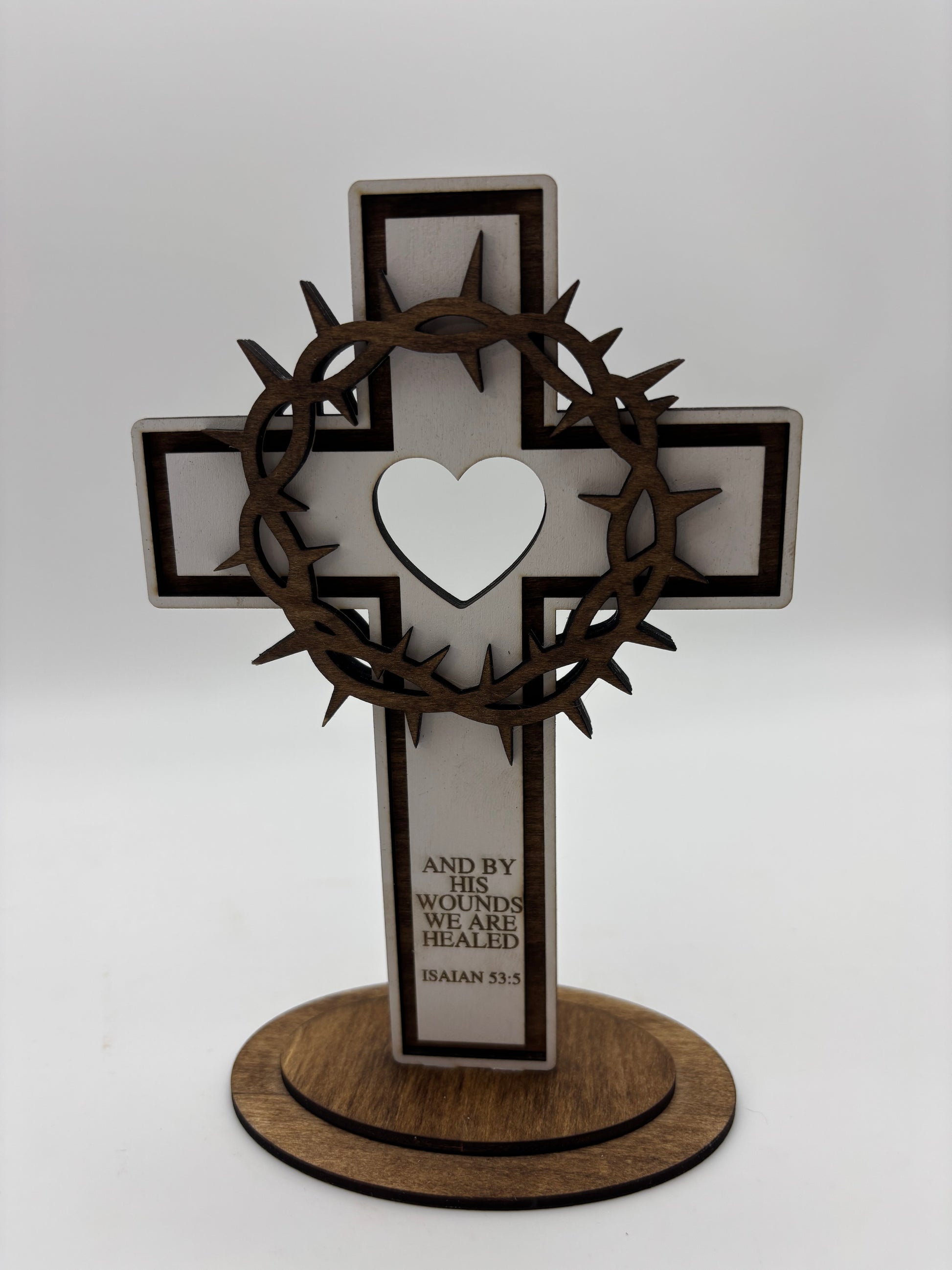 This beautifully crafted And By His Wounds We Are Healed wood cross tabletop serves as a meaningful reminder of faith and healing. Made of high-quality wood, its intricate design and powerful message make it the perfect addition to any home decor. Let its presence bring comfort and inspiration to your daily life. Stands 8 1/2 inches tall.